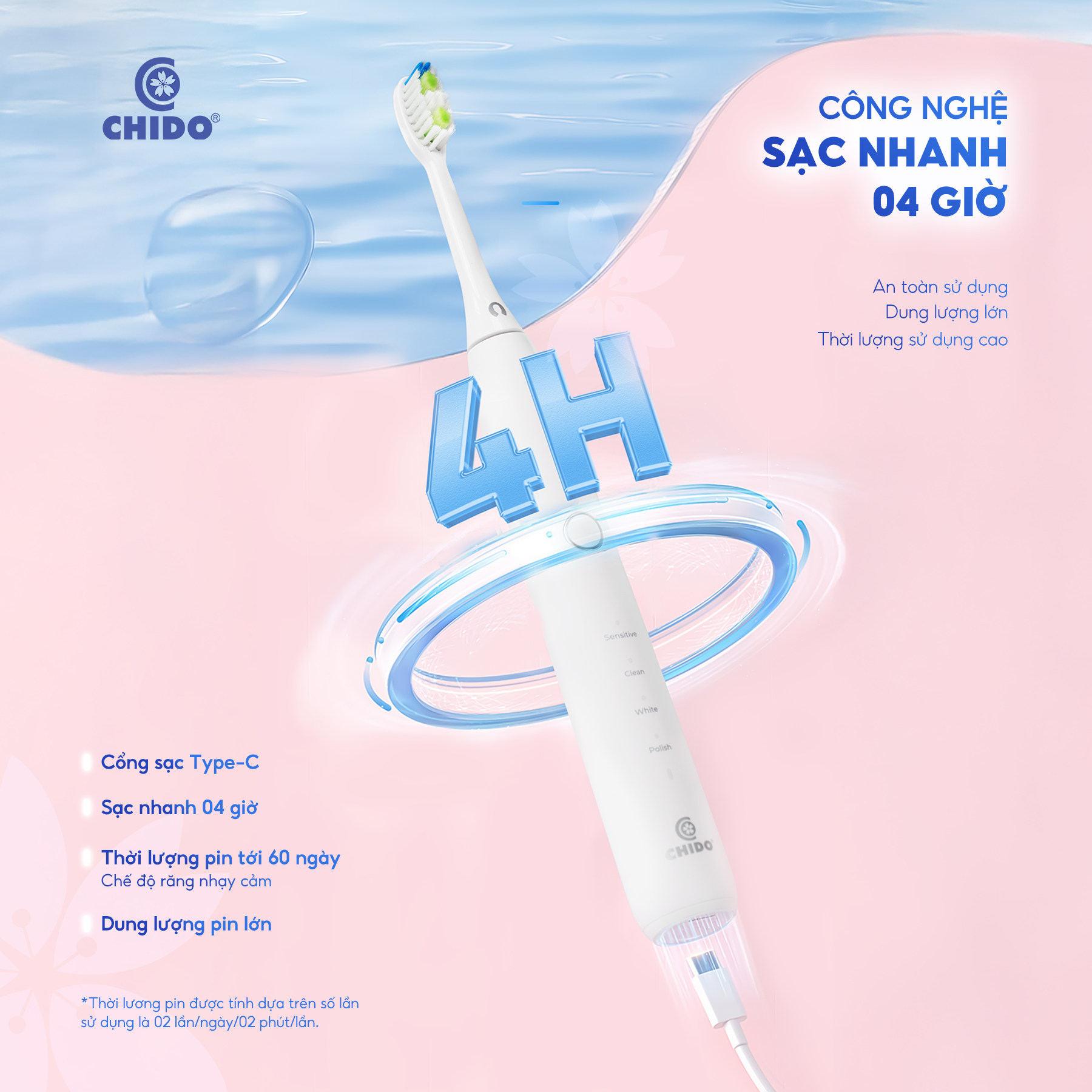 Với 4 chế độ thông minh này, bàn chải điện Chido đáp ứng mọi nhu cầu chăm sóc răng miệng của bạn và gia đình, từ bảo vệ nhẹ nhàng đến làm sạch và làm trắng chuyên sâu.