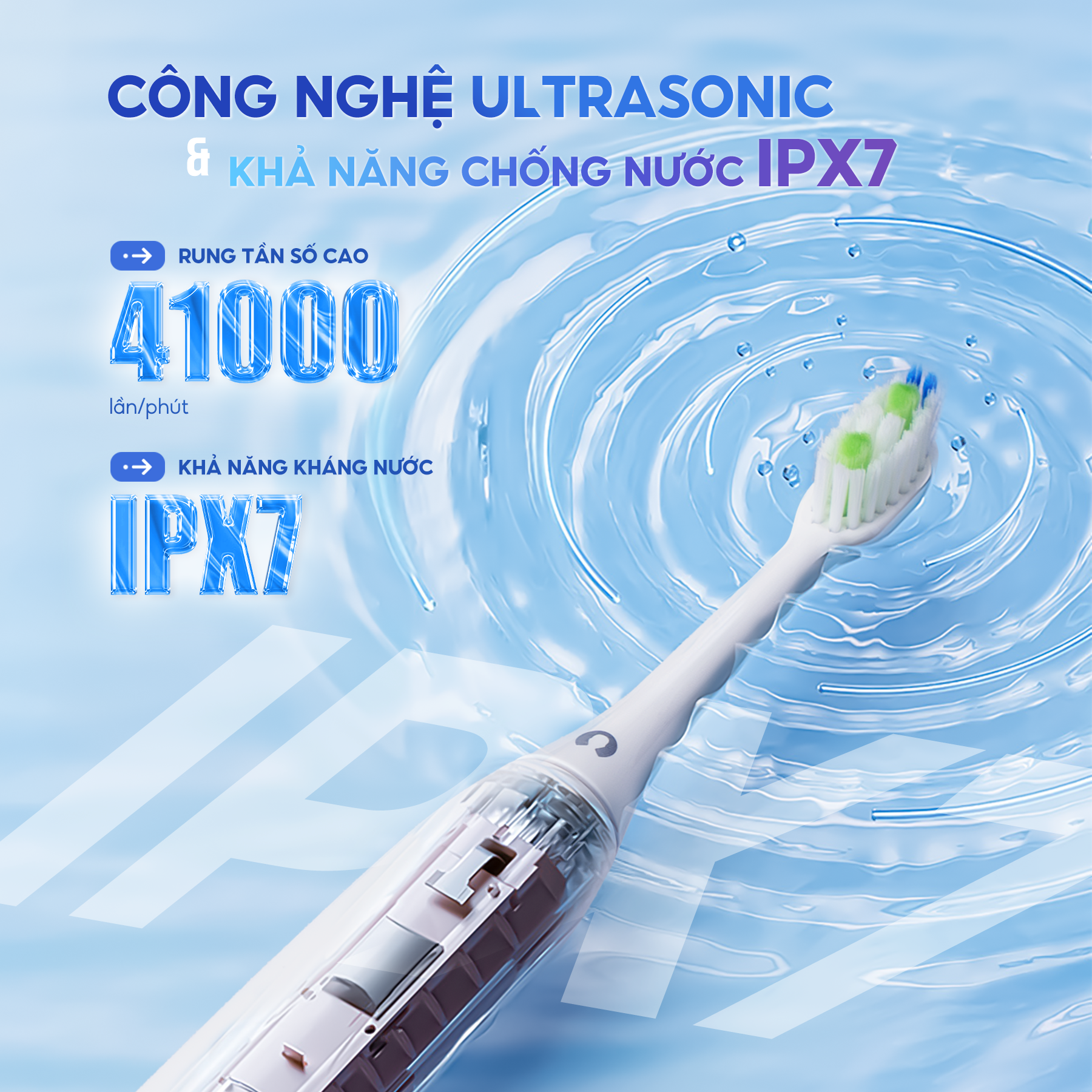 Tần số cao lên tới 41.000 nhịp/phút tạo ra các bọt khí siêu nhỏ với áp lực lớn đánh bay cặn thức ăn thừa, mảng bám nhanh chóng, kể cả các khu vực khó làm sạch như kẽ răng, chân răng, khoang miệng, cho răng trắng sạch .